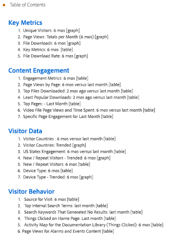 So I ended up with a set of 25 monthly metrics grouped in 4 areas, including large-print “key metrics,” for my automatically distributed Adobe Analytics workspace PDF, as shown in the following table of contents. The three focus areas – Content Engagement, Visitor Data, and Visitor Behavior – roughly align with the three key requests I initially identified.