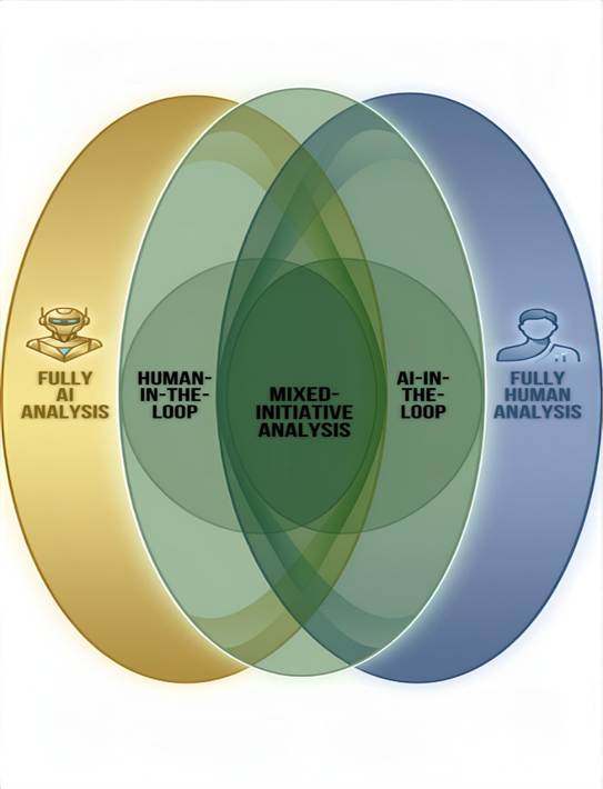 In a 2023 discussion of human-AI teaming (HAT), the United Nations Institute for Disarmament Research (UNIDIR) Dr. Mennatallah El-Assady presented the HITL spectrum as a Venn diagram (see representation in Figure 1 below). Her model suggests that some systems might be entirely automated and others entirely manual, but most lie somewhere in between. The spectrum challenges us to think about what each “agent” brings to the problem at hand.